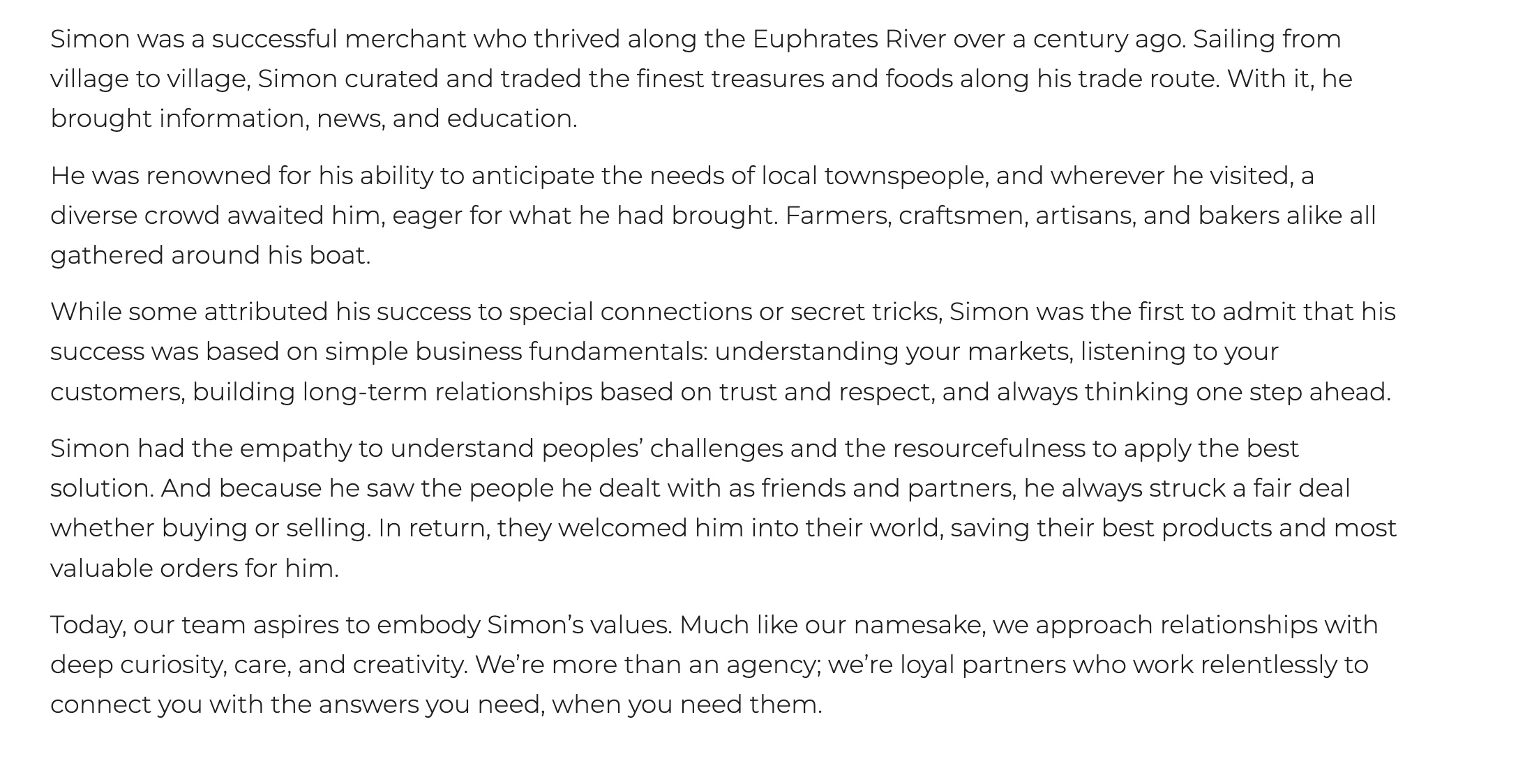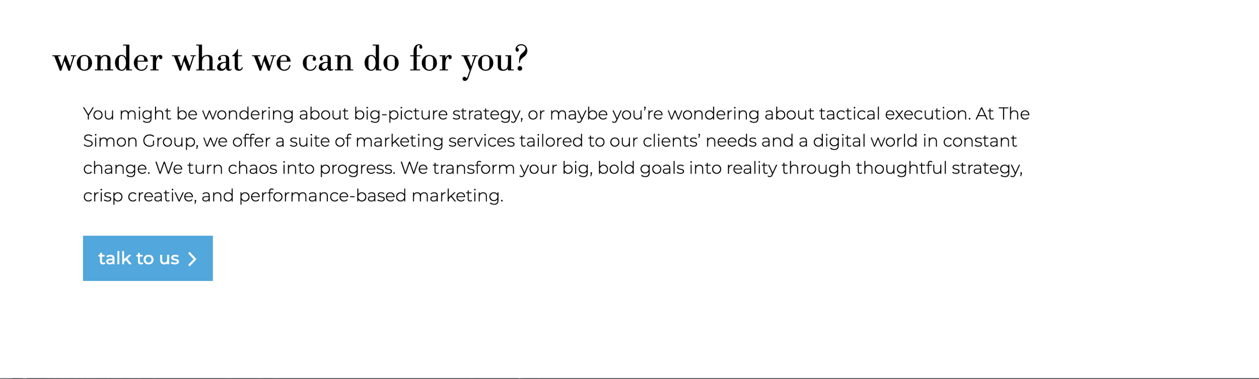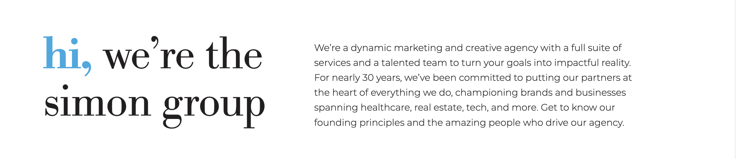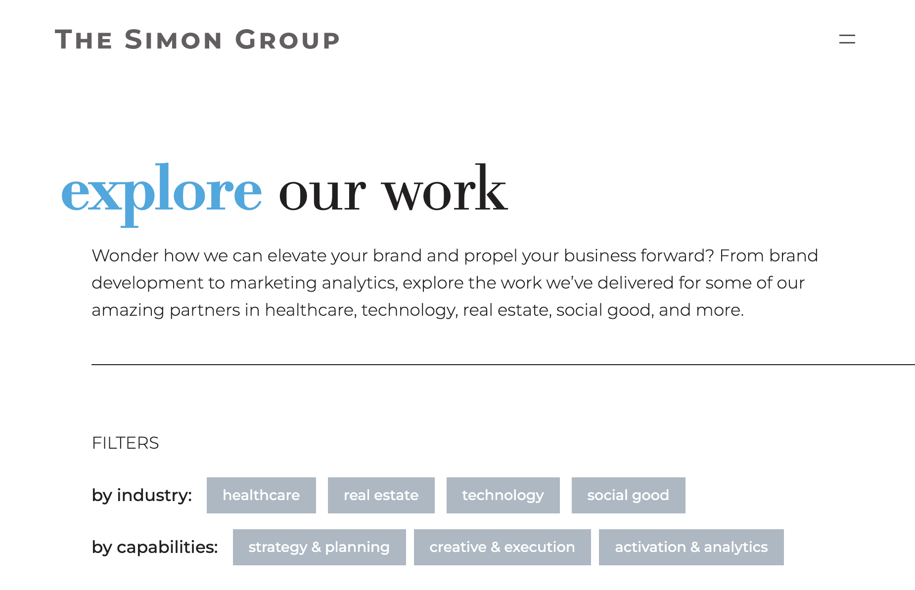 I also helped the agency refine and elevate their positioning and branding to attract new clients. With the theme of unlocking wonder, I led the content strategy, wrote the copy, and optimized SEO for The Simon Group’s new website. You can see some of the work below.